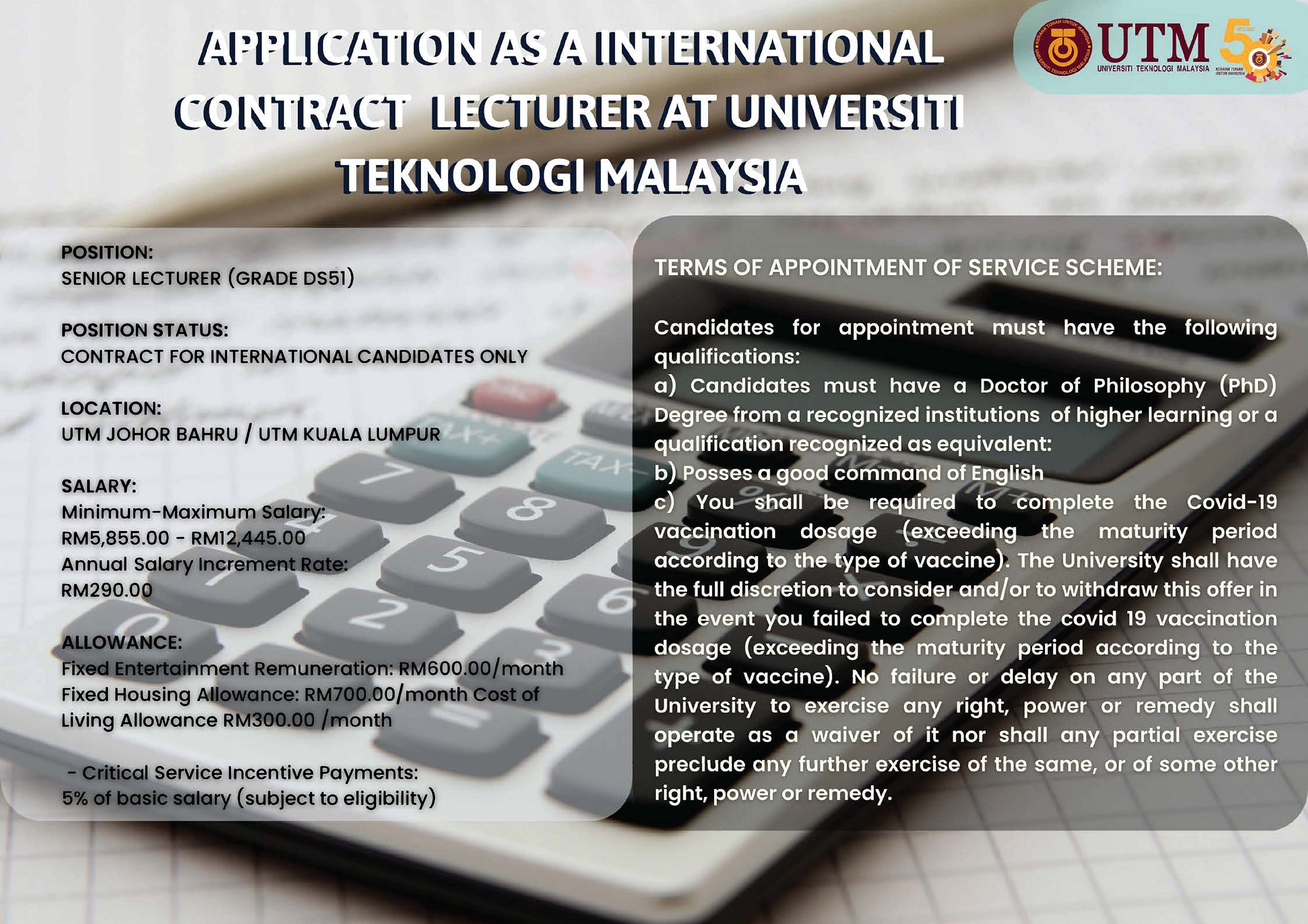 หน้าหลัก ข่าวประชาสัมพันธ์ รายละเอียด AN INTERNATIONAL CONTRACT LECTURER IN UNIVERSITI TEKNOLOGI MALAYSIA (UTM) เอกสารแนบ : GUIDELINE TO APPLY POSITION AS ACADEMIC STAFF IN UTM ประกาศวันที่ : 7 เมษายน พ.ศ. 2566, โดย : จันจิรา วงษ์ศรี