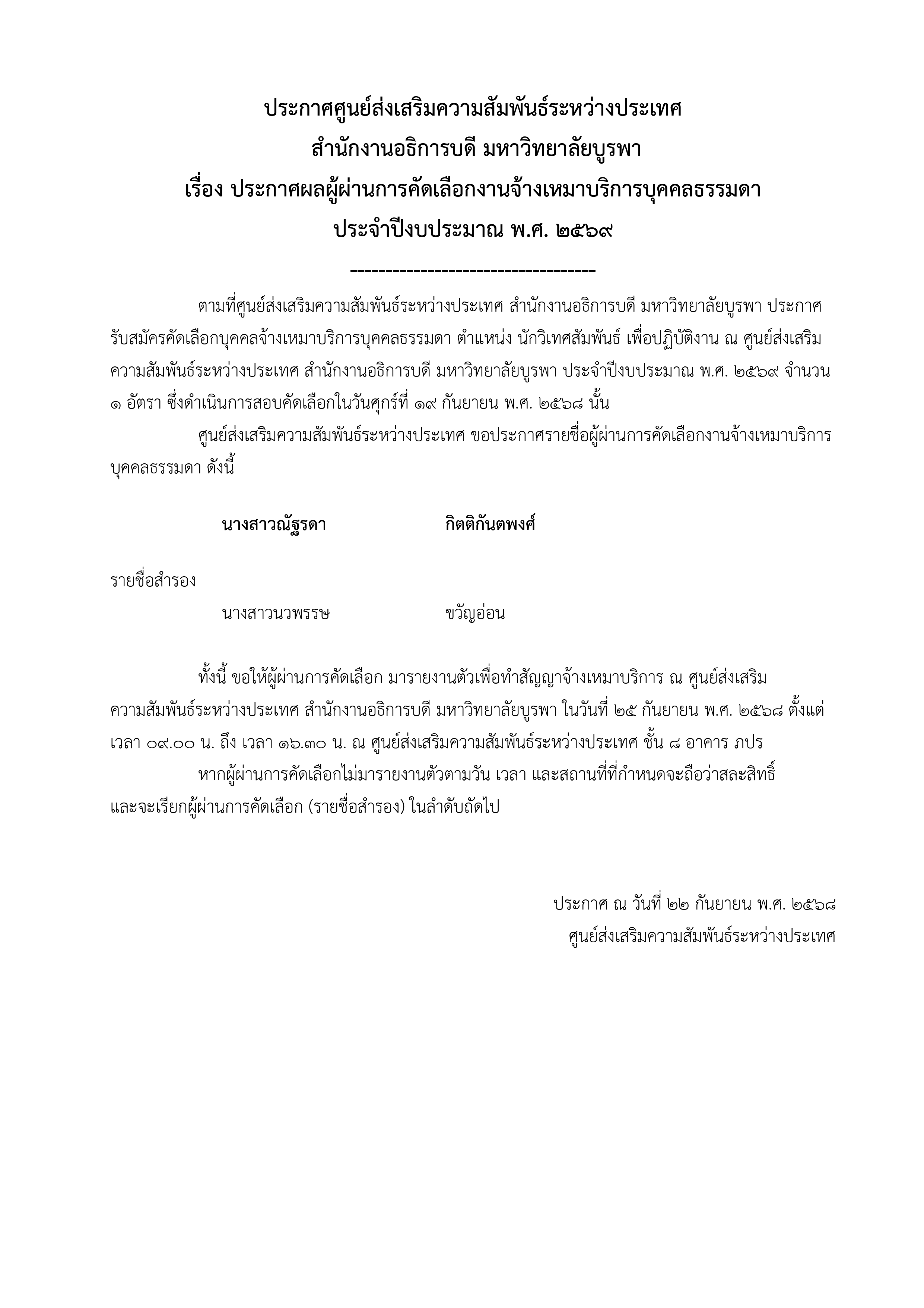 หน้าหลัก ข่าวประชาสัมพันธ์ รายละเอียด ประกาศศูนย์ส่งเสริมความสัมพันธ์ระหว่างประเทศ เรื่อง ประกาศผลผู้ผ่านการคัดเลือกงานจ้างเหมาบริการบุคคลธรรมดา ประจำปีงบประมาณ พ.ศ. 2569 ประกาศวันที่ : 22 กันยายน พ.ศ. 2568, โดย : จันจิรา วงษ์ศรี