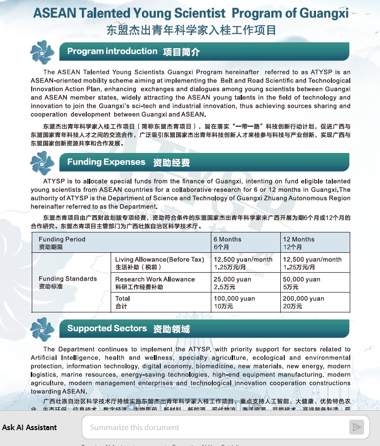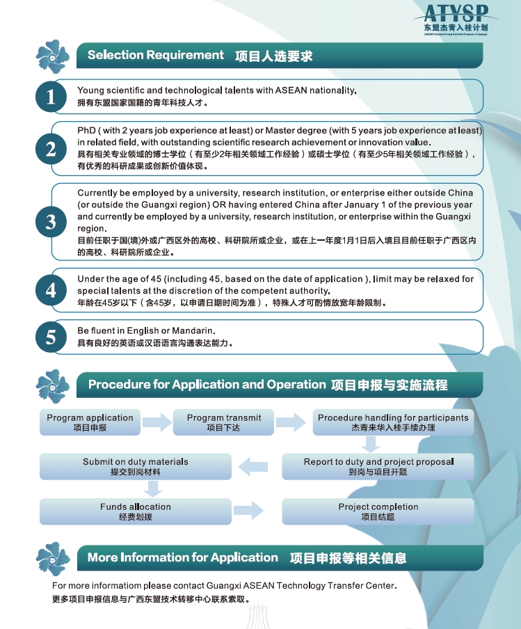 สถานเอกอัครราชทูตไทย ณ กรุงปักกิ่ง ประชาสัมพันธ์ โครงการ ASEAN Talented Young Scientist Program of Guangxi (ATYSP) ดำเนินโครงการโดยDepartment of Science and Technology of Guangxi Zhuang Autonomous Region) สาธารณรัฐประชาชนจีน โครงการมีวัตถุประสงค์เพื่อส่งเสริมการแลกเปลี่ยนบุคลากรด้านวิทยาศาสตร์และเทคโนโลยีระหว่างกว่างซีและประเทศสมาชิกอาเซียน ภายใต้แผนปฏิบัติการนวัตกรรมวิทยาศาสตร์และเทคโนโลยี "หนึ่งแถบหนึ่งเส้นทาง" (Belt and Road) ผู้ที่ได้รับการคัดเลือกให้เข้าร่วมโครงการจะได้เข้าร่วมปฏิบัติงานวิจัยร่วม ณ เขตกว่างซีจ้วง เป็นระยะเวลา 6 เดือน หรือ 12 เดือน โดยมีรายละเอียดสังเขป ดังนี้